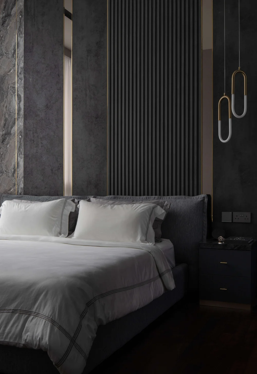 A luxurious bedroom with a striking mix of dark tones, gold accents, and textured panels, creating a bold and sophisticated atmosphere.